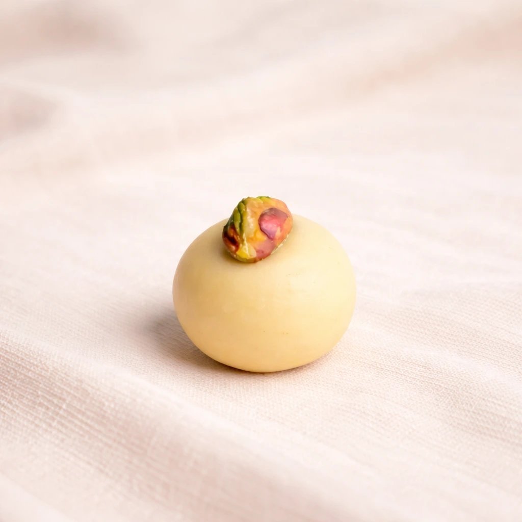 Verpakking voor de geboorte van een jongen met drie verfijnde lekkernijen: witte amandel dragees, marsepein met amandel en pistache en pistache Raha.
