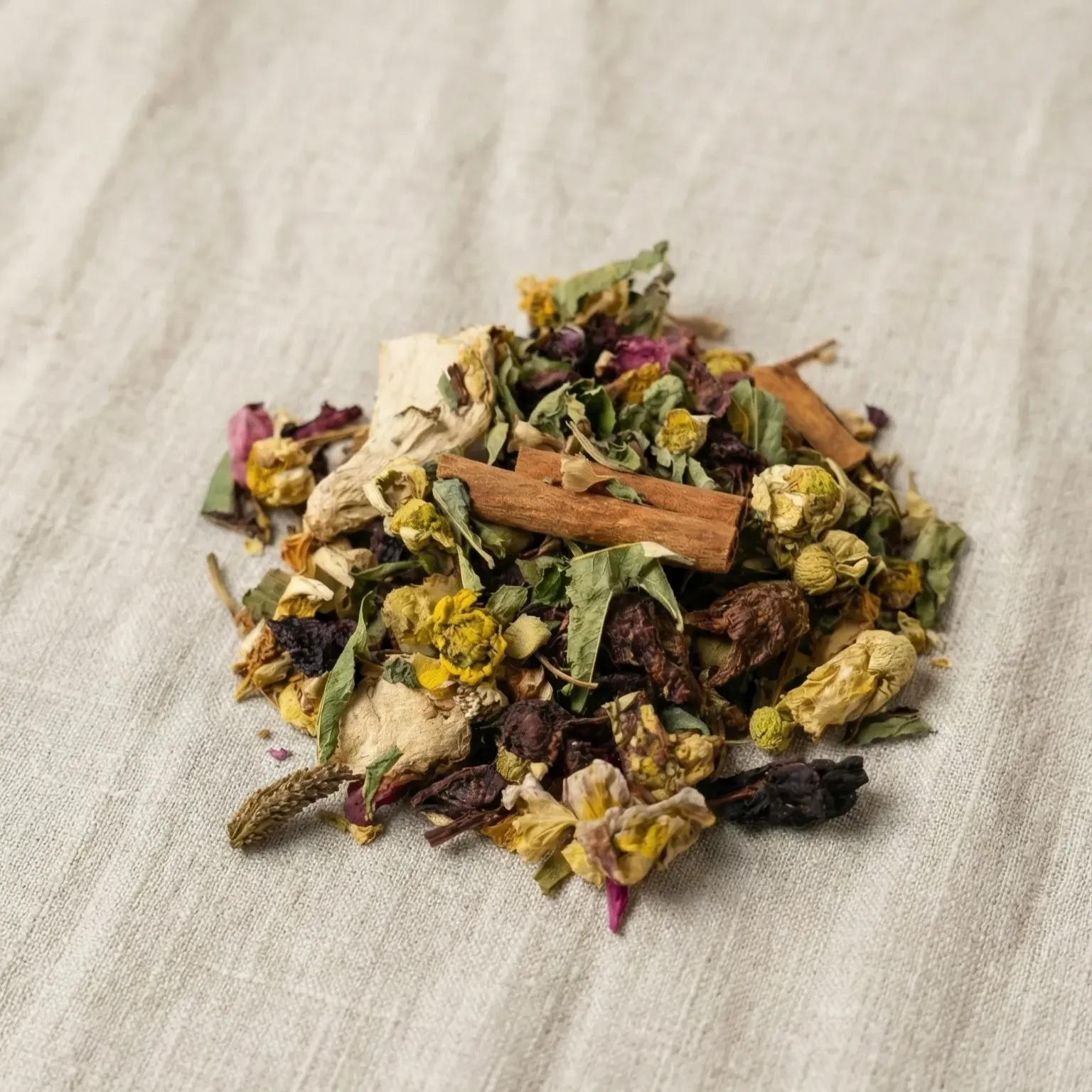 Kruidenmix met kamille, kaneel en gember voor nachtrust, kalme maag en nieuwe energie.